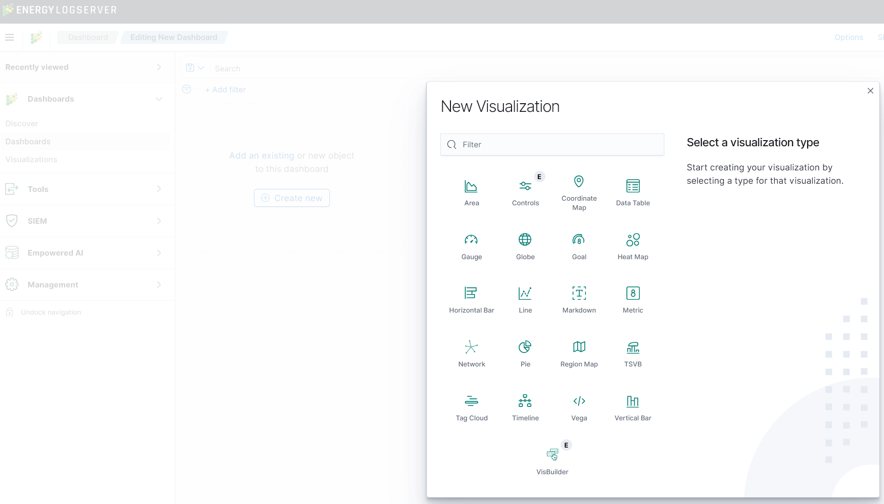 Visualize enables you to create visualizations of the data in your Energy Logserver indices. You can then build dashboards that display related visualizations. Visualizations are based on Energy Logserver queries. By using a series of Energy Logserver aggregations to extract and process your data, you can create charts that show you the trends, spikes, and dips.