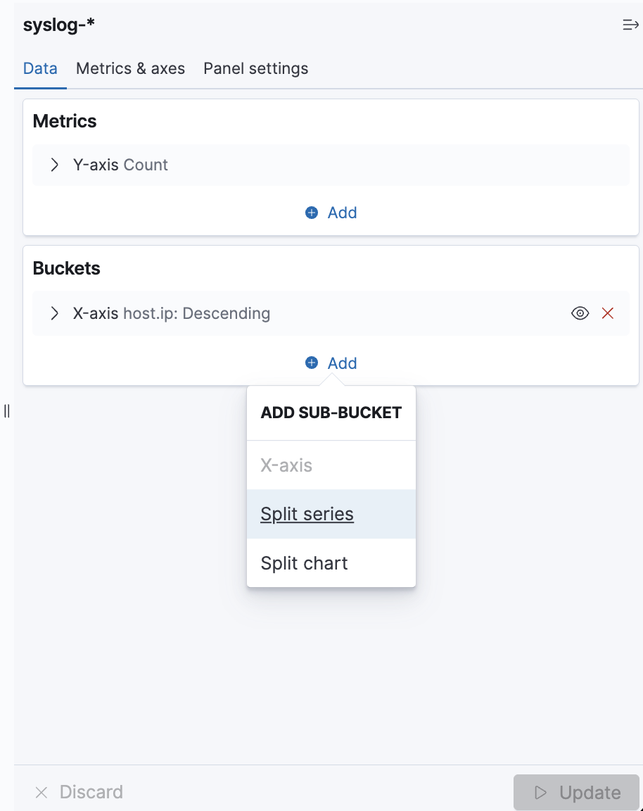 Bucket Aggregations: X-Axis (time), Y-Axis (count), Split Series (by severity).