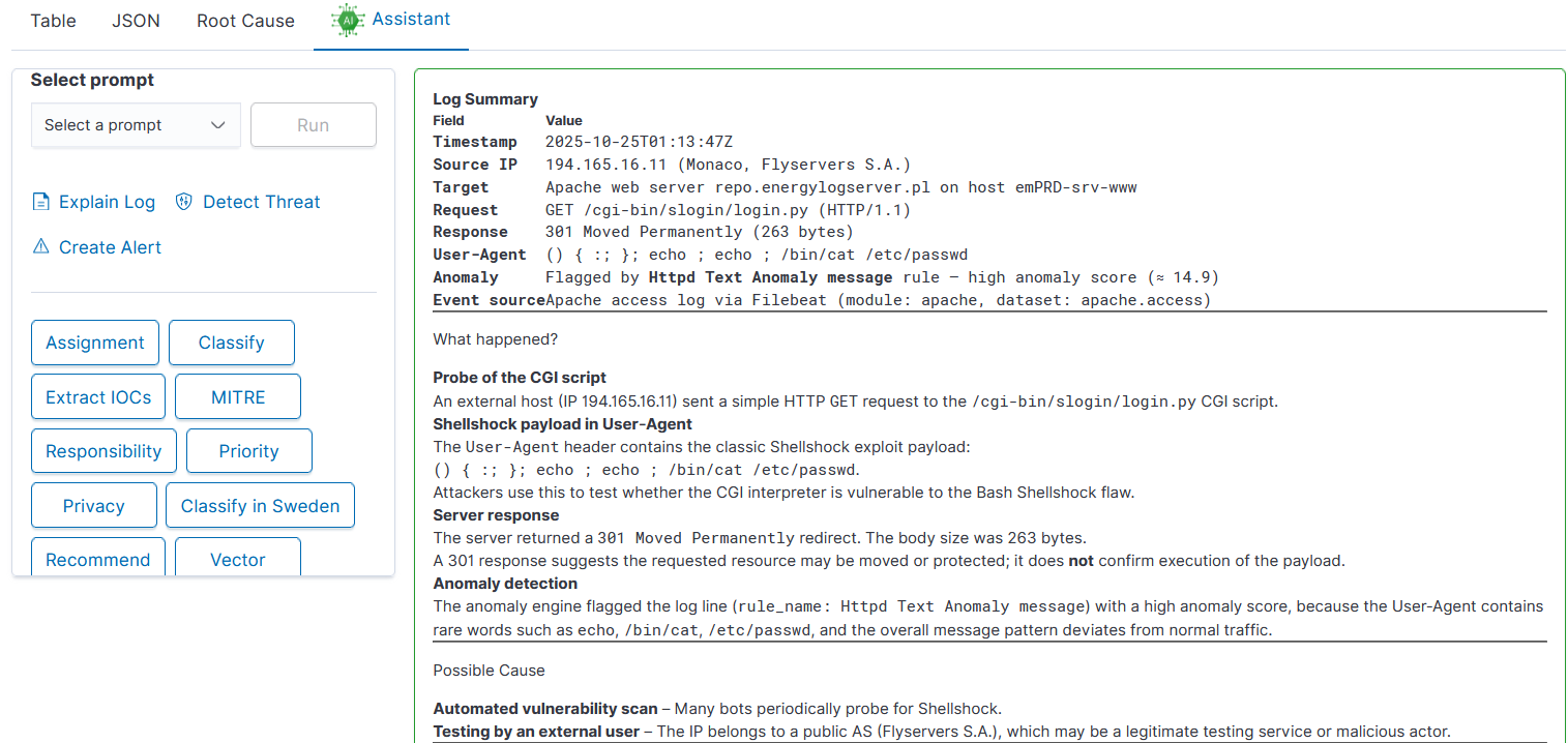 Log analysis is empowered with AI Assistant. For each log entry user can run predefined prompts or use own prompts for deeper analysis.