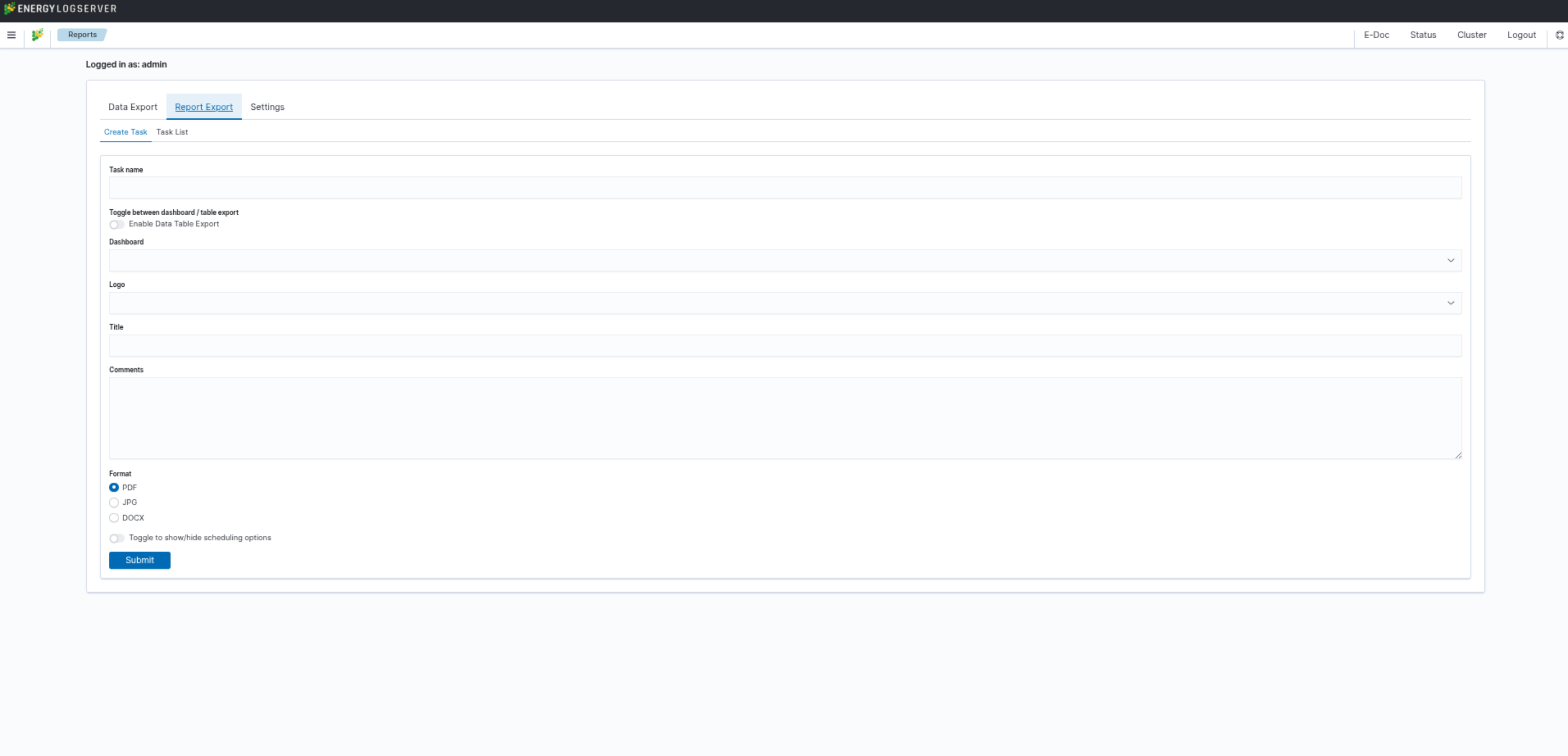 To create a report, go to the Report Export tab and fill in the Create Task form: