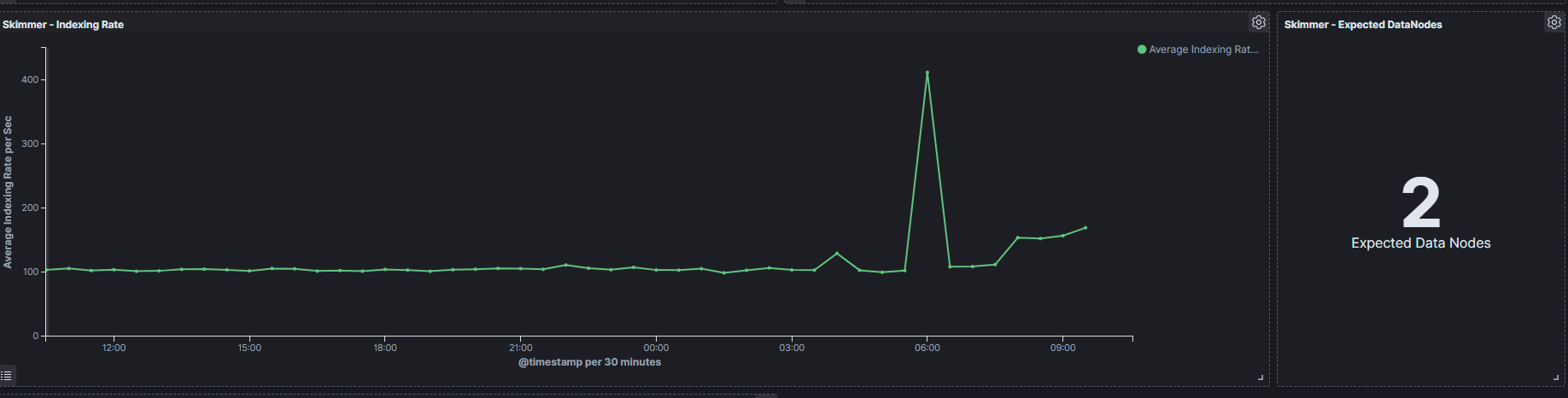 Data Node - Heap usage in percent- is the total amount of Java heap memory that’s currently being used by the JVM Data Node process in percentNetwork Probe - Heap usage in percent- is the total amount of Java heap memory that’s currently being used by the JVM Network Probe process in percentData Node - Process CPU usage- is the amount of time for which a central processing unit was used for processing instructions of Elsticsearch process in percentData Node - Node CPU usage- is the amount of time for which a central processing unit was used for processing instructions for specific node of Data Node in percentData Node - Current queries- is the current count of the search query to Data Node indicesData Node - Current search fetch- is the current count of the fetch phase for search query to Data Node indicesGC Old collection- is the duration of Java Garbage Collector for Old collection in millisecondsGC Young collection- is the duration of Java Garbage Collector for Young collection in millisecondsFlush- is the duration of Data Node Flushing process that permanently save the transaction log in the Lucene index (in milliseconds).Refresh- is the duration of Data Node Refreshing process that prepares new data for searching (in milliseconds).Indexing- is the duration of Data Node document Indexing process (in milliseconds)Merge- is the duration of Data Node Merge process that periodically merged smaller segments into larger segments to keep the index size at bay (in milliseconds)Indexing Rate- an indicator that counts the number of saved documents in the Data Node index in one second (event per second - EPS)Expected DataNodes- indicator of the number of data nodes that are required for the current loadFree Space- Total space and Free space in bytes on Data Node cluster