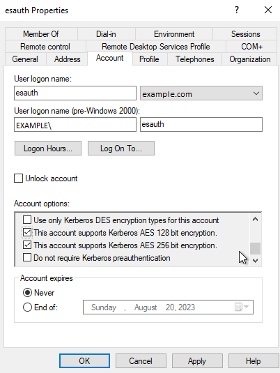 sso.domain: "example.com" ldaps: - name: "example.com" host: "IP_address" port: 389 # optional, default 389 ssl_enabled: false # optional, default true ssl_trust_all_certs: false # optional, default false bind_dn: "esauth@example.com" # optional, skip for anonymous bind bind_password: "password" # optional, skip for anonymous bind (AD admin's password) search_user_base_DN: "cn=Users,DC=example,DC=com" user_id_attribute: "uid" # optional, default "uid" unique_member_attribute: "uniqueMember" # optional, default "uniqueMember" service_principal_name: "HTTP/loggui.com@EXAMPLE.COM" # principal name used while generating the keytab file service_principal_name_password: "Sprint$123" # -pass used during keytab creation